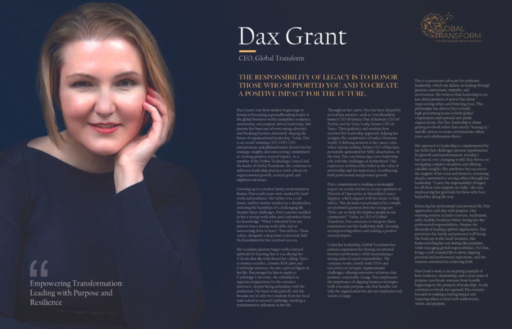 Dax Grant’s rise from modest beginnings in Bosnia to becoming a groundbreaking leader in the global business world exemplifies resilience, mentorship, and purpose-driven leadership. Her journey has been one of overcoming adversity and breaking barriers, ultimately shaping the future of organizational leadership. Today, Dax is an award-winning CEO, COO, CIO, entrepreneur, and philanthropist, known for her strategic insights and unwavering commitment to creating positive societal impact. As a member of the Forbes Technology Council and the leader of Global Transform, she continues to influence leadership practices with a focus on organizational growth, societal good, and employee advocacy.