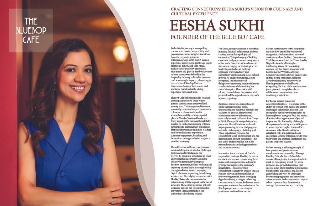 BlueBop Café embodies Eesha’s vision of creating an immersive space where patrons connect on an emotional and sensory level. This unique establishment seamlessly combines live jazz music with culinary excellence and a soulful atmosphere, swiftly earning a special place in Mumbai’s cultural landscape. Every aspect of the café was thoughtfully curated by Eesha, transforming ordinary moments into extraordinary experiences that resonate with her audience. It is here that her multifaceted expertise in customer engagement, branding, and innovation converges, offering not just a meal but a memory.
